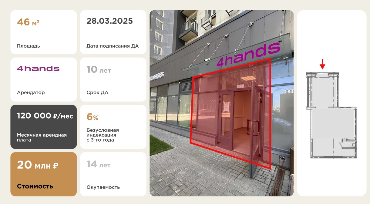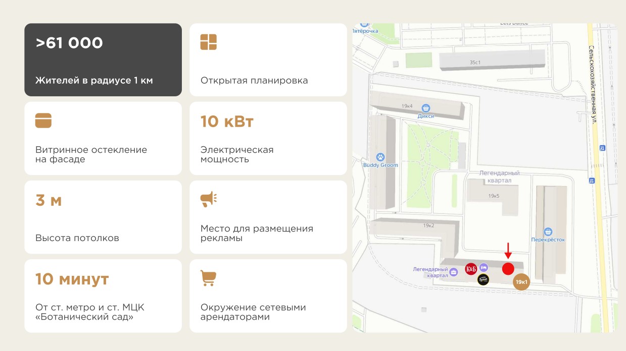 Коммерческое помещение в ЖК "Легендарный квартал" Общая информация Расположение: ЖК "Легендарный квартал" Этаж: первый Площадь: 46 м² Высота потолков: 3 м Состояние: помещение с отделкой Арендатор: ногтевая студия "4 hands" Планировочные решения Вход: отдельный с первой линии Окна: витринные Особенности: Открытая планировка Мокрая точка Полноценная зона разгрузки Возможность размещения наружной рекламы Инфраструктура и окружение Транспортная доступность: 10 минут пешком до метро Ботанический сад 2 минуты транспортом до Владыкино 10 минут до ТТК или Рижского вокзала 20 минут до центра города Инфраструктура района: Пункт выдачи Wildberries Пекарня "Буханка" Магазин "Красное и Белое" Усадьба "Свиблово" с парком Центр водных видов спорта с олимпийским бассейном Паркинг: стихийный